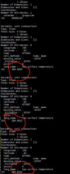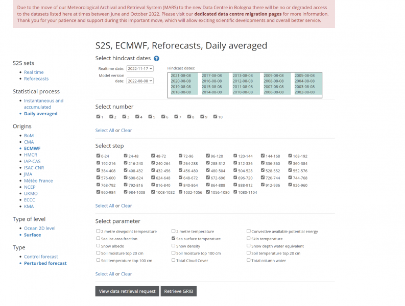 下载EC S2S 10个member 扰动预报20年回报结果,选择了SST这一变量,查看数据结果发现非常奇怪,对比同日期同格点的ERA5观测数据,ERA5数据就很正常,不知是否要对EC数据进行处理