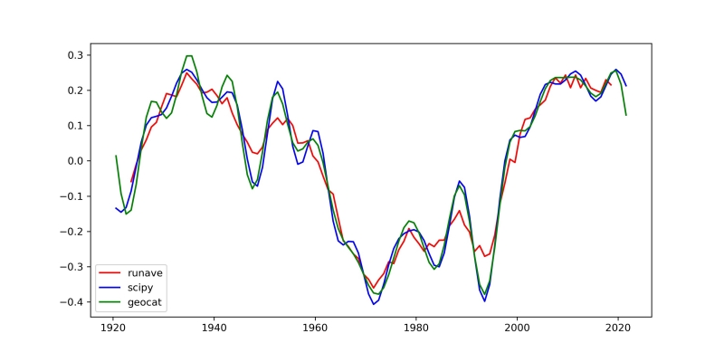 之前都没用过geocat的滤波,今天试了下和常用的scipy和滑动平均比较了一下效果还是比较好的,分享参考一下。方便省去构造滤波器,适合多维数组