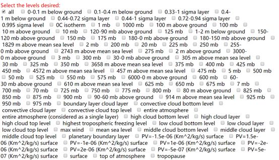 由于之前高度层选的全部,尝试修改其中的高度层信息,选择500mb和600mb,得到的url为https://nomads.ncep.noaa.gov/cgi-bin/filter_gfs_0p50.pl?file=gfs.t00z.pgrb2full.0p50.f003&lev_500_mb=on&lev_600_mb=on&var_HGT=on&var_RH=on&var_TMP=on&var_UGRD=on&var_VGRD=on&subregion=&leftlon=50&rightlon=120&toplat=50&bottomlat=5&dir=%2Fgfs.2019041600,高度层相关的lev_500_mb=on&lev_600_mb=on。