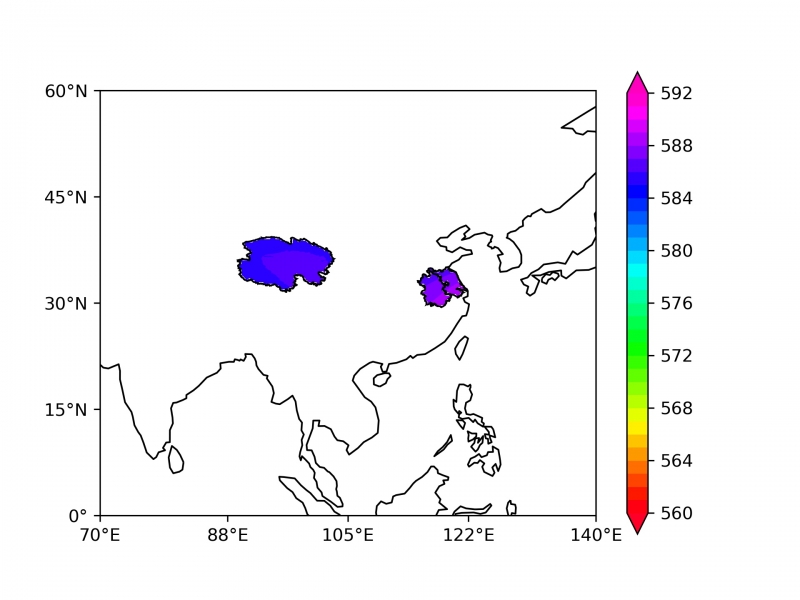 首先,遇到地图白化问题,家园有帖子提出了解决办法,另外,“云台书使”公众号还汇总了常见的几种做法。比如maskout白化,但是没有源文件很麻烦,要说抓住核心语句,对填色或者等值线的collections做set_clip_path,但是我回头一看,它是用cartopy.io的部分读取shp文件的。有些以国标编码的shp不能用cartopy读取(因为不知道怎么设置编码方式),所以我使用shapefile来读shp。裁剪的核心函数set_clip_path需要的path,用Path(坐标点)是不能满足的,所以这种方法失败了。而且,还有一个问题,由于set_clip_path把一个shp外部屏蔽了,如果我要画多个shp,就会互相屏蔽,最后只剩下一个shp有效白化了,除非把很多shp拼接成一个。所以说,这种方法不好。另外两种方法要用到salem和geopandas,对于我这种懒人,懒得装,也懒得学。(而且以前在windows试着安装了geopandas,报错,装不成)。所以乍一看好像方法挺多,但实用的好像不多。今天我发现一个很重要的函数Polygon.contains_points,它可以判断点是否在区域内。So, 问题解决了。我完全可以暴力点,只用我自己的方法去做。不需要它cartopy的添加feature,我直接自己用Ploygon来画shp的地图,而且用它来生成我需要的填色的区域。我试着用2017年的月平均位势高度来画,白化青海、安徽和江苏三个省。废话不多少,看代码,看注释。另外,oyl库的map是一个画地理地图的库,本质是基于cartopy的,各位观众可以不必理会,只要知道它相当于跳过了定义底图就可,不影响阅读。