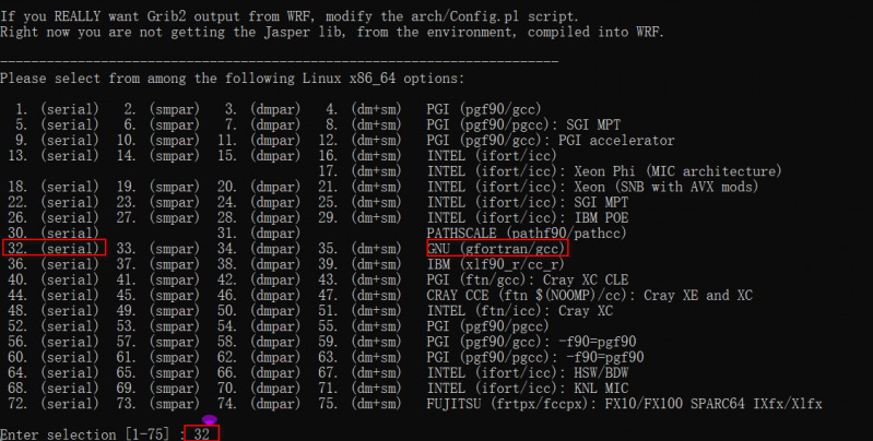 这里是让你选择以什么样的编译器进行安装,咱们用GUN(gfortran/gcc),这样就只有32-35了。