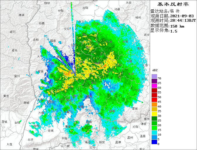 晚8点44分的临汾站雷达图,可见测站上空至东方有成片的松散回波活动。