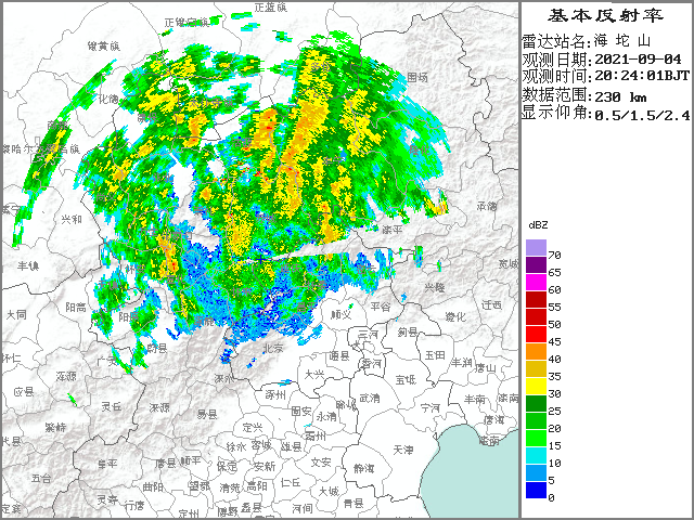 晚8点24分的北京海坨山站雷达图,可见测站上空、北方和西方多松散强回波活动。