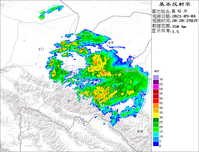 晚8点20分的嘉峪关站雷达图,可见测站北方、西方和东方有松散强回波活动。