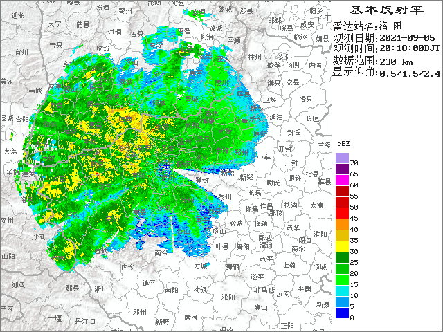 晚8点18分的洛阳站雷达图,可见测站西方有大片松散回波区。