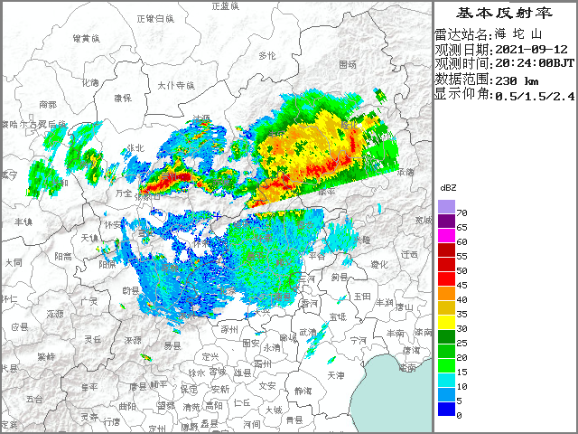 晚8点24分的北京海坨山站雷达图,可见测站北方有一系列强回波活动,尤其东北方有成片的强回波。