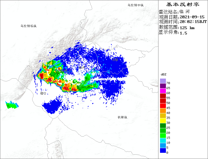 晚8点2分的临河站雷达图,可见测站西方和南方有一条由一系列块状强回波构成的强回波带。