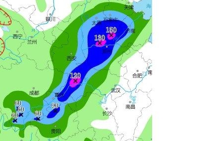 截至今天上午8点,华北西南部-西北地区东南部一带出现强降水:其中陕中偏西的扶风57.3mm,豫西北的渑池52.5mm。预报未来一天,华北中、南部、陕西-四川盆地东部一带将出现大范围强降水:其中豫北一带的两个强降水分别可达130mm以上和150mm以上。