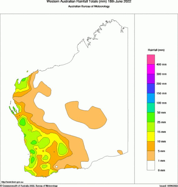 受第34条冷锋以北的副热带锋区云带及其后部大槽中的松散云系影响,西澳大利亚州西部出现强降水:其中西南部的西海岸中部地区一站暴雨散森溪坝(站号509307)53mm;诶文-思万地区一站暴雨位于皮尔思皇家空军(站号9053)50mm;中西部沿海两站暴雨,最大降水中心沃拉达基东(站号508063)72mm;西北角一站暴雨位于里尔芒司机场(站号5007)69mm。