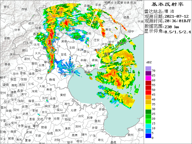 同一时间的天津站雷达图,可见测站西方、北方和东方有成片的松散强回波活动。