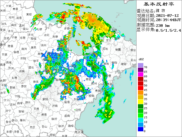 晚8点39分的潍坊站雷达图,可见测站周围地区有松散强回波活动,尤其测站北方有成片的强回波。