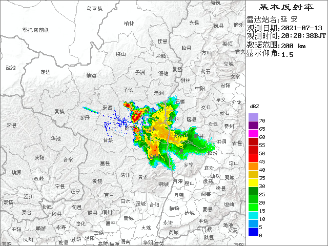 晚8点20分的延安站雷达图,可见测站东方有一大的松散块状强回波活动。