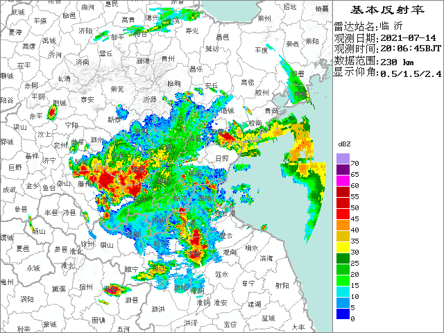 同一时间的临沂站雷达图,可见测站西方、南方和东方有块状强回波活动,尤其测站西方的块状强回波较大。