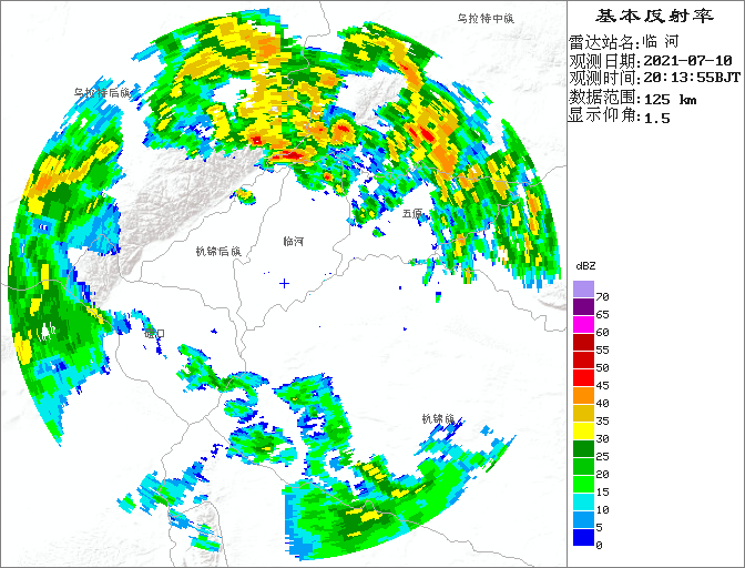 晚8点13分的临河站雷达图,可见测站北方和西方多松散强回波活动。