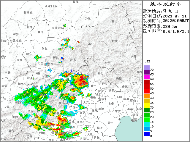 晚8点半的北京海坨山站雷达图,可见测站南方多分散的块状强回波活动。