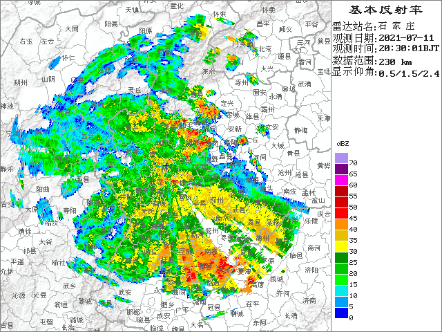 同一时间的石家庄站雷达图,可见测站上空及其周围地区有大片松散强回波活动。