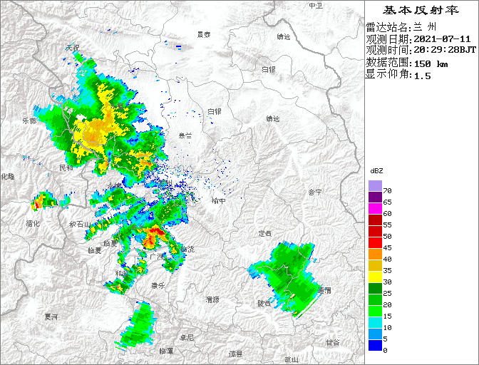同一时间的兰州站雷达图,可见测站西方有一些分散的强回波活动。