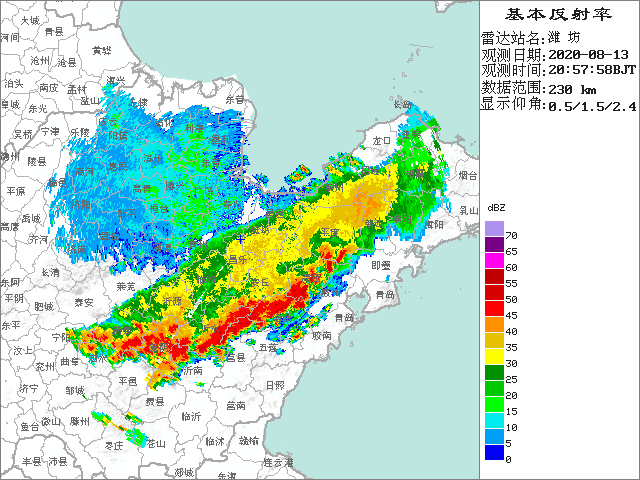 晚8点57分的潍坊站雷达图,可见大片东北-西南向强回波带经过测站上空。