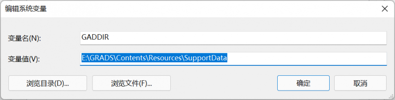 如果出现此类问题,按第2步打开环境变量,仍旧是新建环境变量,“变量名:”设置为GADDIR,“变量值:”设置为你安装的GRADS的“……\Contents\Resources\SupportData”,比如我的是在如下图所示的路径中。