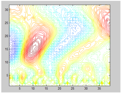 6.      command window 编辑栏中输入contour(coefs,方差最小值负(将confs数据复制到excle里用函数min和max查找最大和最小值): 线条间隔数(如0.3,0.8,根据方差大小设置,如方差在-2-2间,则线条间隔不应超过1):0,':'),回车,出现虚部结果,command window 编辑栏中输入hold on 回车,输入contour(coefs,0:线条间隔数(如如0.3,0.8,根据方差大小设置): 方差正最大值),回车,出现完整图形。